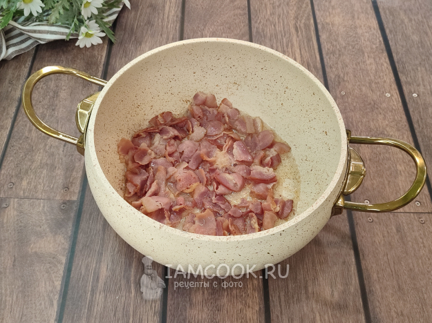 В толстостенной кастрюле (казане) разогрейте масло, выложите нарезанный бекон, обжарьте до румяности.