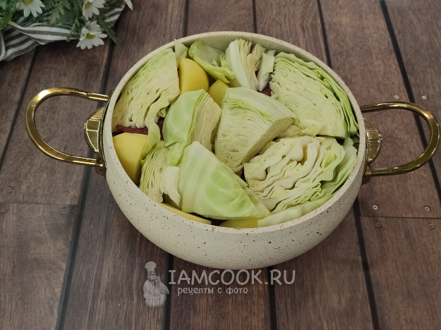 Если капусту нашинковать, она станет слишком объёмной, ее сложно будет уместить в кастрюлю, поэтому крупными ломтиками плотно укладываем ее сверху. После приготовления все овощи станут мягкими, капуста сама "разделится" на лепестки.