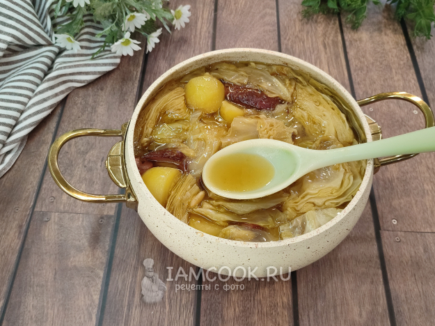 Сверху капусту я слегка присолила. У нас все копчености солёные, поэтому лучше при необходимости добавить соли по вкусу в самом конце. В кастрюлю вливаем желаемое количество воды, я налила 500 мл. После закипания накрываем крышкой, огонь убавляем до слабого (2-3 из 9) и в прямом смысле забываем про суп на 2,5 часа. А спустя время получаем вот такую вкусноту и красоту - посмотрите на этот золотистый бульон! А аромат какой... Мммм...