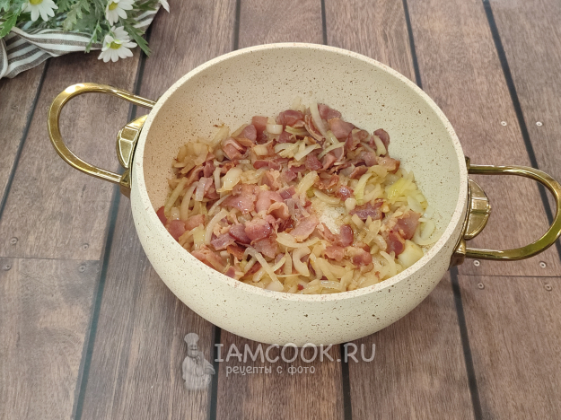 К бекону добавьте нарезанный соломкой лук, измельченный чеснок, обжарьте, пока лук не станет золотистым.