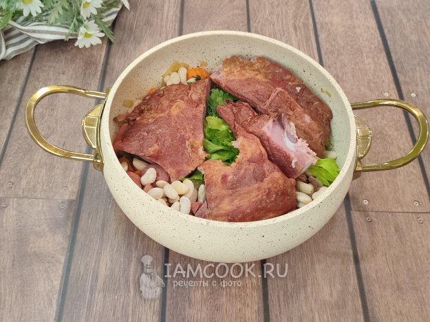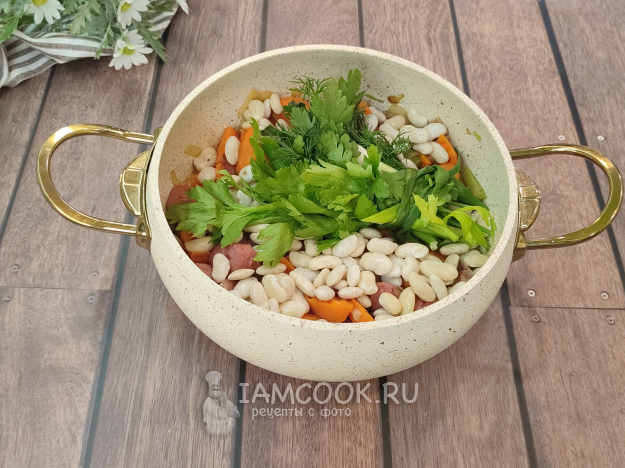 А теперь закладываем все оставшиеся ингредиенты: фасоль, букет "Гарни"...