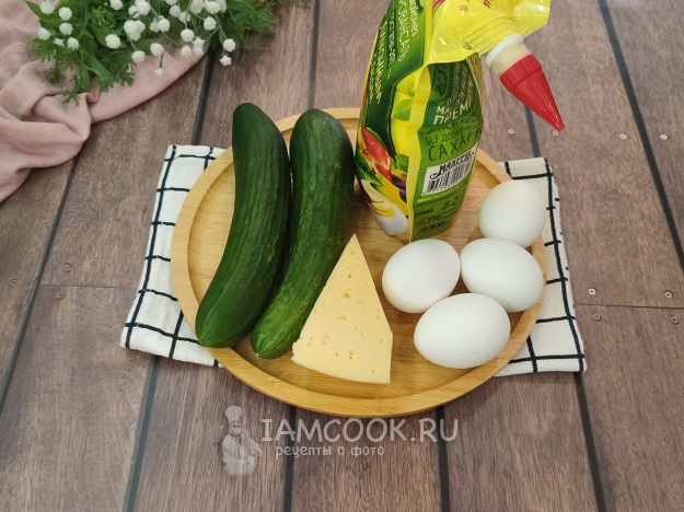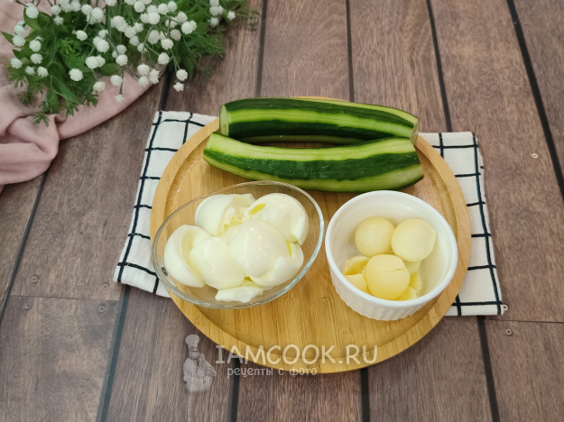 Яйца нужно очистить, отделить белки от желтков. Огурцы можно полностью очистить от кожицы, можно частично.
