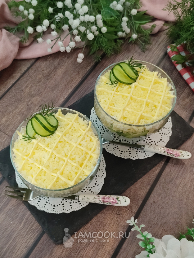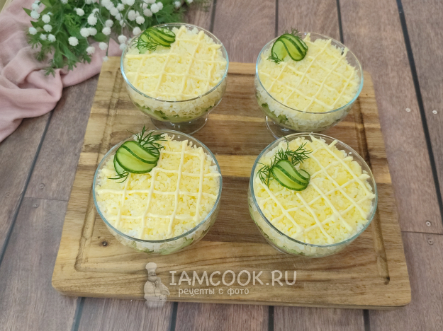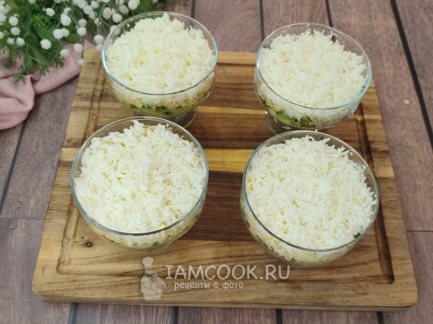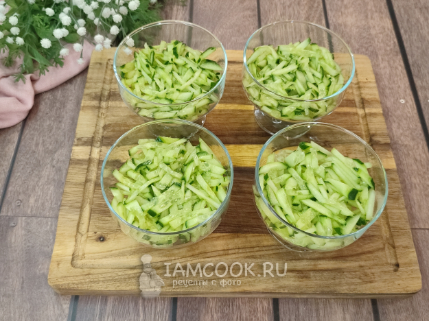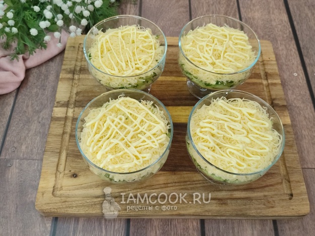 Салат можно, конечно, собрать в одном большом блюде, мне сегодня хочется порционную подачу. В каждую креманку выкладываем слой огурцов, можно слегка присолить по желанию, на огурцы наносим майонезную сетку.