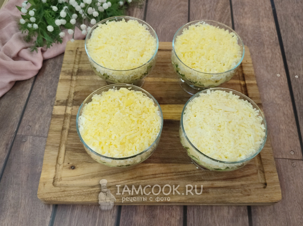 Белки и желтки натираем на мелкой терке сразу в креманки, не утрамбовываем, лишь слегка распределяем. Сначала белки, сеточка майонеза...