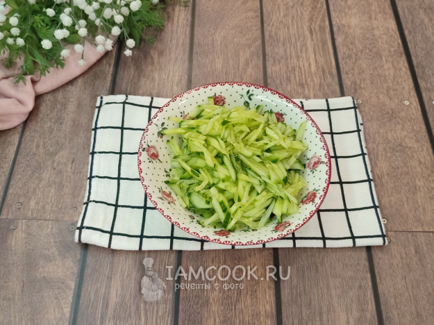Огурцы нарежьте тонкой соломкой.