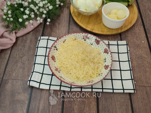 Сыр натрите на мелкой терке, так салат будет нежнее.