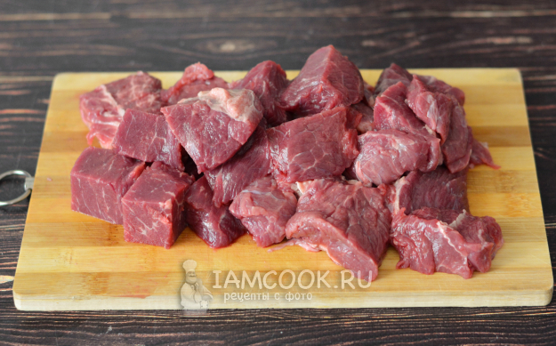 Нарежьте говядину крупными кусками примерно 3х3 сантиметра.