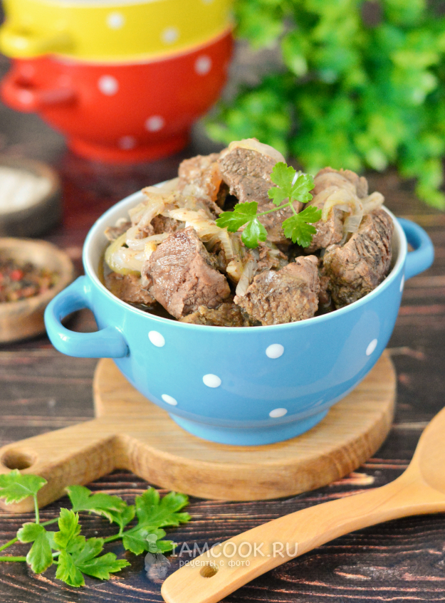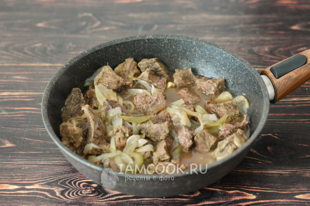 Томите говядину до мягкости в собственном соку, стараясь не открывать крышку часто, чтобы не потерять влагу. За время томления пару раз можно перемешать, но не более. В процессе томления говядина выделит достаточное количество сока и будет томиться в нём. Но если вдруг вы обнаружите, что сока мало, то добавьте буквально 70-100 мл воды к мясу.
