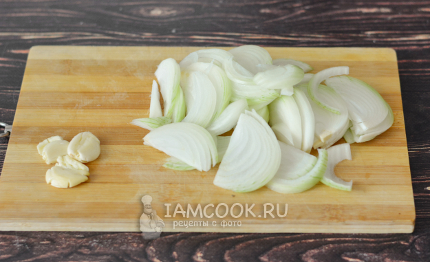 Лук и чеснок очистите, сполосните. Лук нарежьте лепестками, а зубчики чеснока просто раздавите плоской стороной ножа.