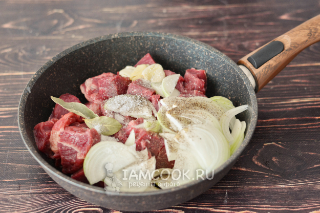 Сложите в глубокую сковороду нарезанную говядину, лук и чеснок. Добавьте сразу соль-перец и пару лавровых листочков.