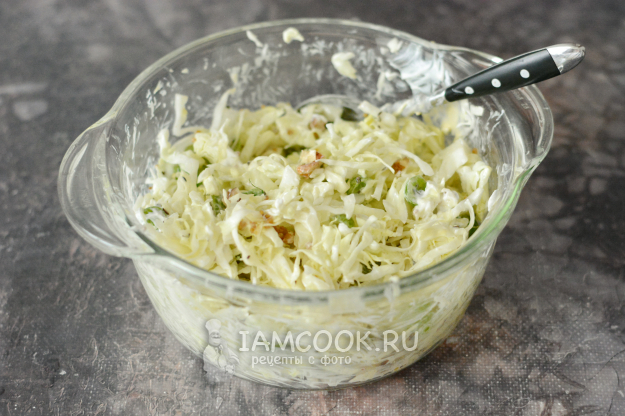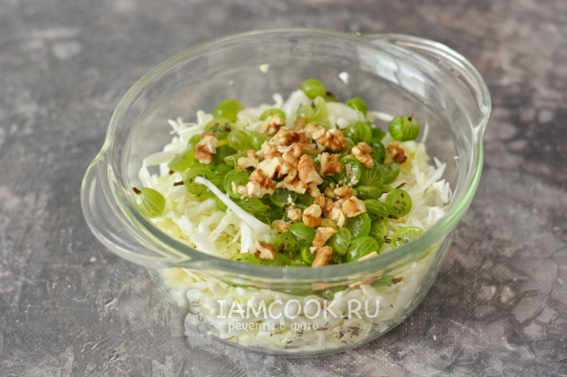 Добавьте к капусте орехи и крыжовник, перемешайте аккуратно всё вместе.