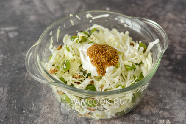 Добавьте в салат сметану и зернистую горчицу.