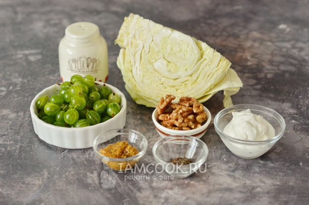 Подготовьте все продукты для капустного салата с крыжовником, орехами и сметаной.