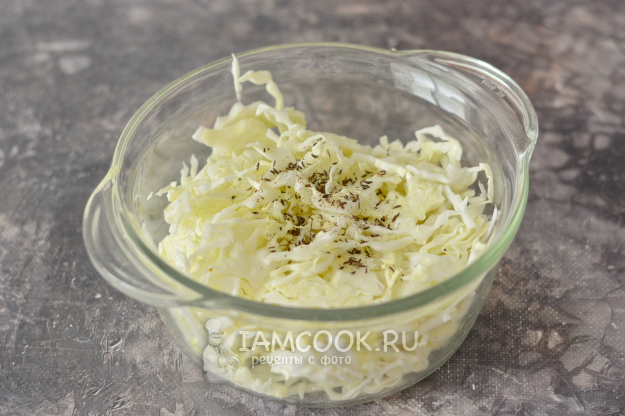 Капусту нашинкуйте тонкой соломкой, сложите в миску. Добавьте щепотку соли и немного растёртого в ступке тмина. Слегка перетрите всё руками.