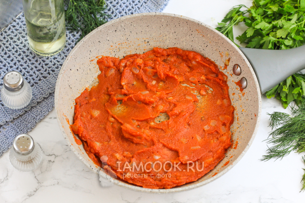 Тщательно все перемешайте, не прекращая обжаривать содержимое емкости. Нужно как бы заварить муку в томатной пасте и масле.