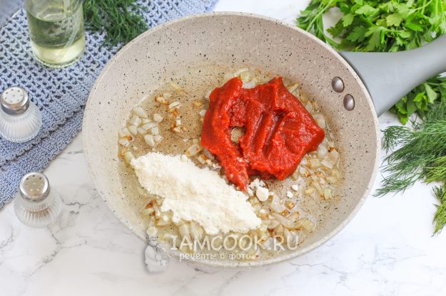 Выложите томатную пасту и всыпьте пшеничную муку высшего сорта.