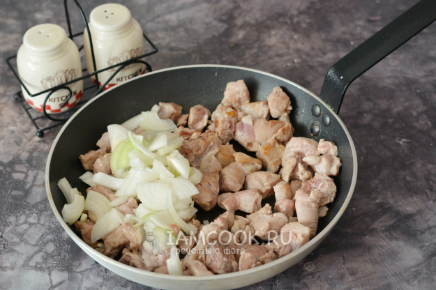На сильном огне быстро обжарьте кусочки свинины, помешивая лопаткой. И как только они слегка поджарятся (3-5 минут), добавьте к свинине лук и обжарьте вместе ещё около 5 минут.