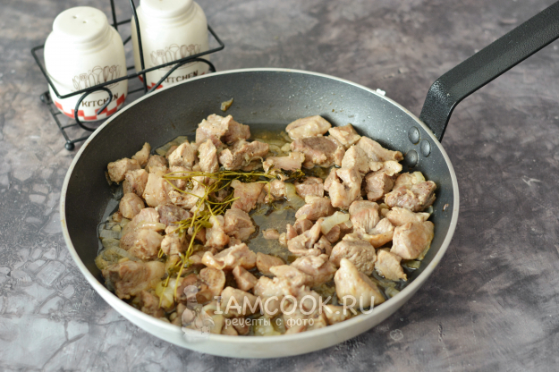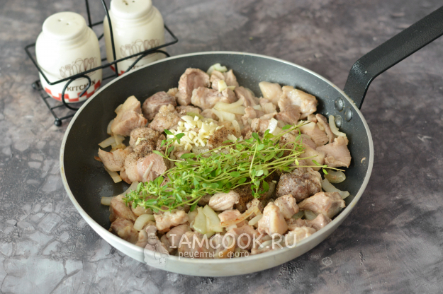 Затем добавьте к свинине нарубленный чеснок, веточки тимьяна, посолите и поперчите по вкусу.