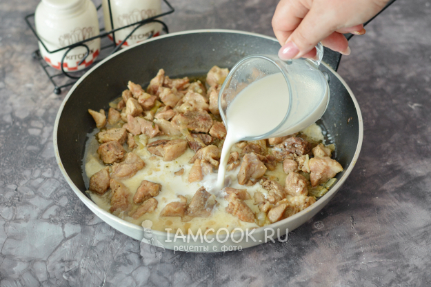 Удалите из сковороды веточки тимьяна. А к свинине влейте сливки и потушите свинину в получившемся сливочном соусе ещё примерно 10 минут.