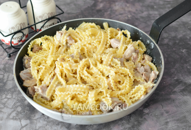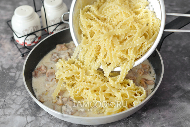 Мафальдине откиньте на дуршлаг, дайте стечь воде и добавьте пасту в сковороду к свинине. Помним про то, что если паста готовится в соусе, то её ни в коем случае не заправляют маслом, иначе соус будет соскальзывать с пасты.