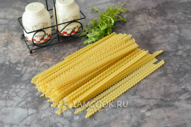 Для этого блюда я выбрала пасту мафальдине. Это длинная широкая плоская паста с волнистыми краями. И эти края волнистые не только для красоты. Волнистый край мафальдине задерживает на себе больше соуса.