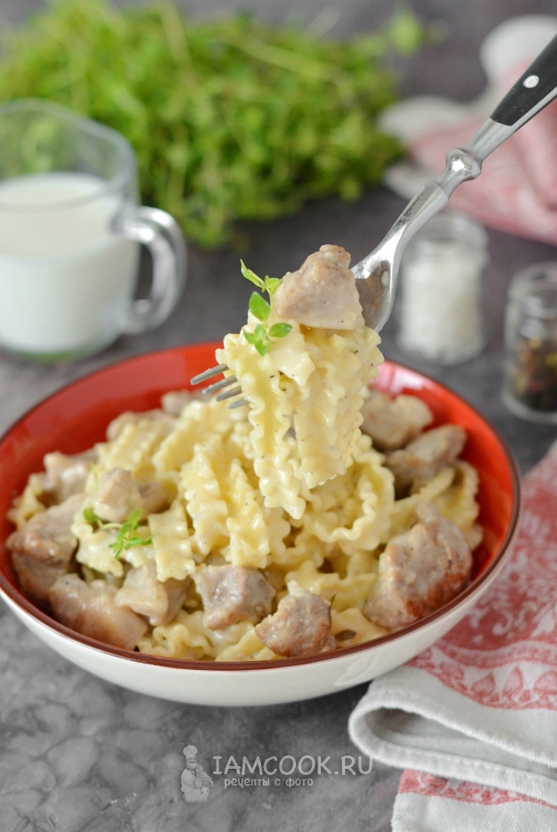 Перемешайте пасту со свининой и сливочным соусом и готовьте всё вместе ещё примерно 2-3 минуты, а тем временем накройте на стол.