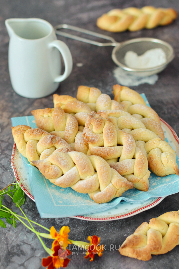 Готовое печенье "Косички" снимите с противня и остудите. При желании присыпьте сахарной пудрой.