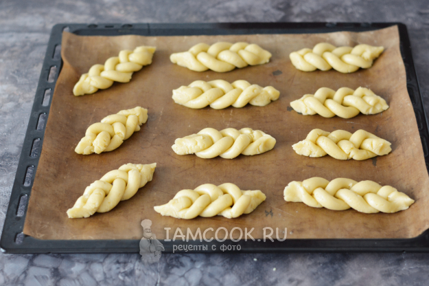 Выложите печенье "Косички" на противень, застеленный пергаментом или ковриком для выпечки. Отправьте в разогретую до 180°С духовку. Выпекайте до румяного цвета, около 10-15 минут. Время выпечки зависит от особенностей вашей духовки, поэтому ориентируйтесь на свою технику.