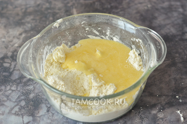 Влейте к мучной крошке яйца с сахаром и руками замесите тесто.