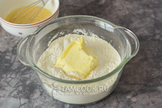 В муку добавьте холодное сливочное масло и порубите его ножом в муке на кусочки, а затем разотрите руками масло с мукой в крошку.