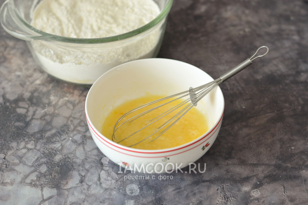 В другой миске смешайте слегка венчиком яйцо с солью и сахаром. Не нужно утомительно взбивать до пены, достаточно просто соединить в однородную массу.
