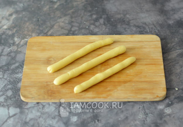 Для формовки печенья отщипните от теста небольшие кусочки (не больше грецкого ореха). Раскатайте эти кусочки в жгуты диаметром около 1 см.