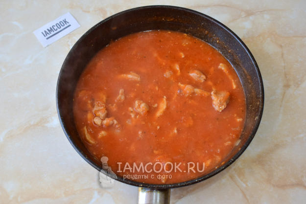 Макароны со свининой в томатном соусе можно подавать к столу в двух видах. Выложите пасту на тарелку, а сверху - свинину в томатном соусе, или же смешайте пасту с мясом в сковороде. Приятного аппетита!