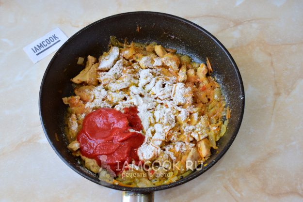 Когда мясо станет мягким, посыпьте его мукой и добавьте в сковороду томатную пасту. Перемешайте.