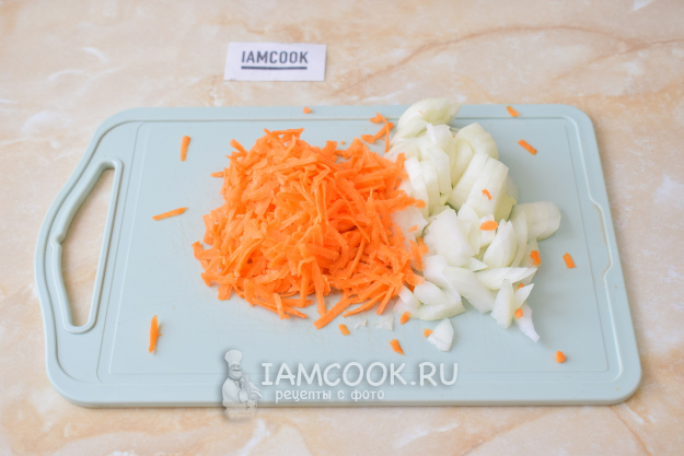 В это время очистите и измельчите лук и морковь. Потрите морковь на терке, а лук нарежьте.