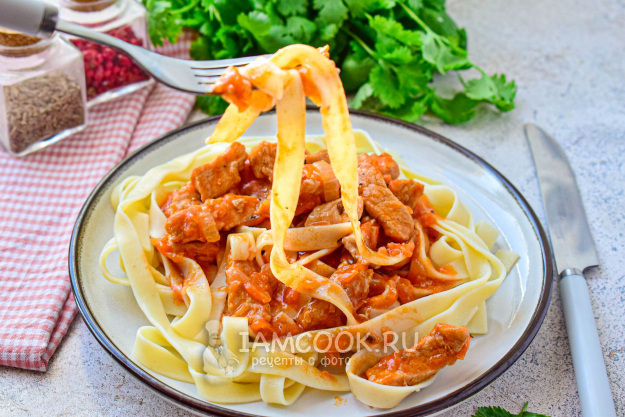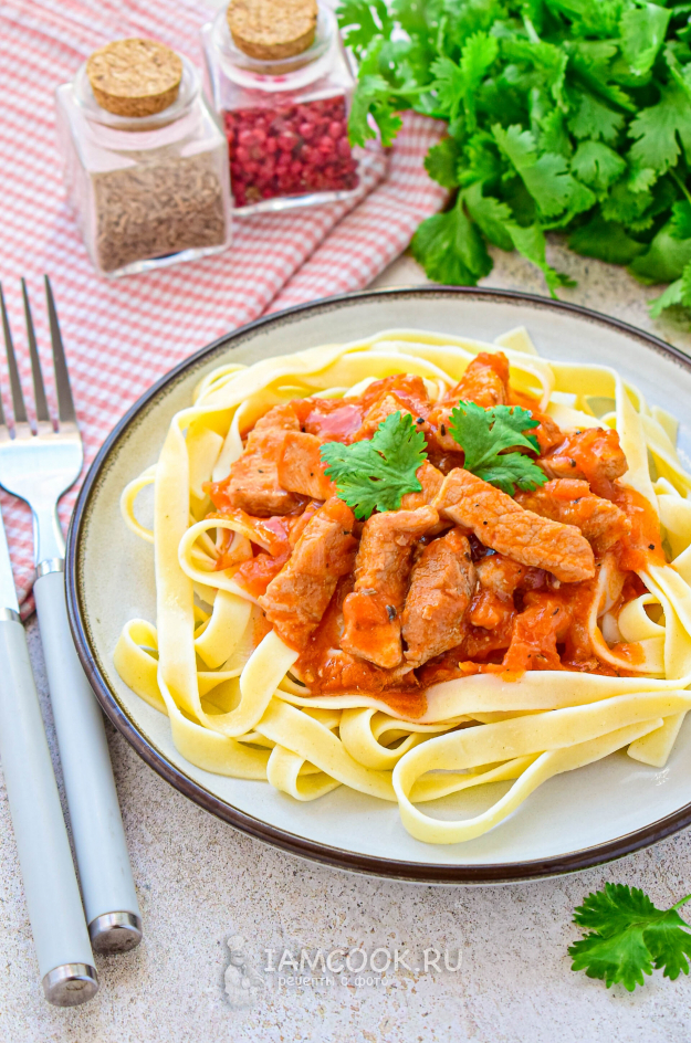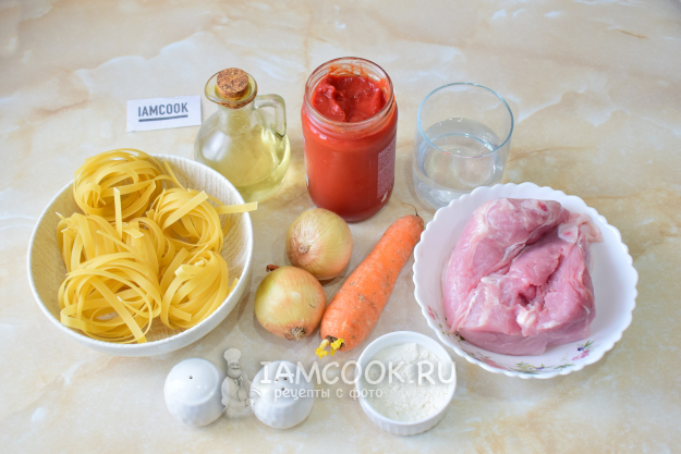 Перед началом приготовления пасты со свининой в томатном соусе соберите необходимые ингредиенты по списку. Пасту можно взять любую. У меня - тальятелле. Свинину выбирайте без костей - окорок или шею.