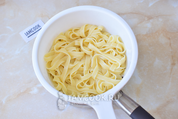 Паста увеличилась в размере и стала мягкой. Откиньте на дуршлаг и пролейте холодной водой.