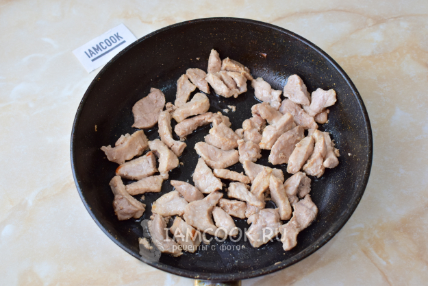 Мясо нарежьте на кусочки и обжарьте с добавлением растительного масла 5-7 минут.