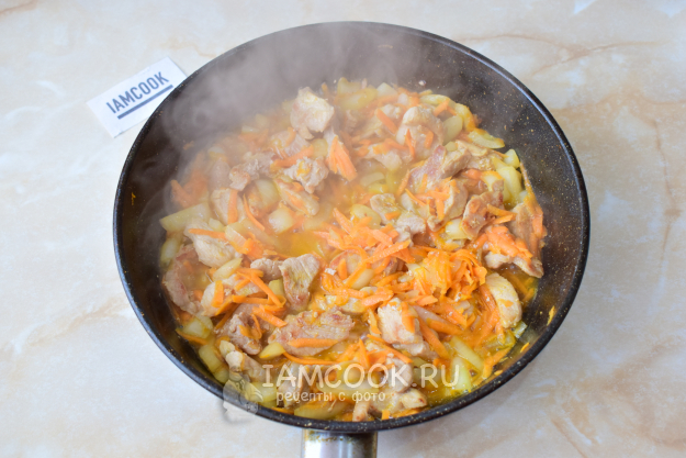 В сковороду к мясу добавьте морковь с луком. Обжарьте все вместе 2-3 минуты. От овощей появится характерный аромат. Затем влейте немного горячей воды и тушите всё под крышкой 20-30 минут, чтобы мясо стало мягким. По вкусу добавьте соль и специи.
