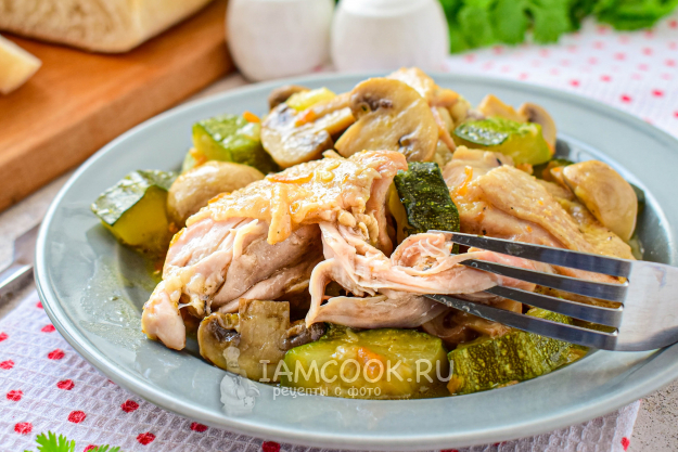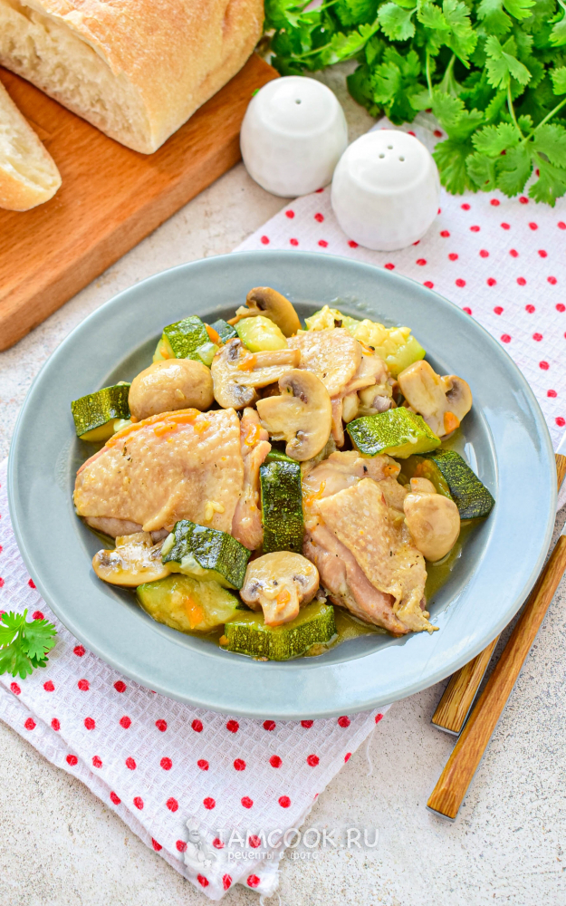 Курицу с кабачками и грибами (шампиньонами) выложите на тарелку и подавайте к столу. Приятного аппетита!