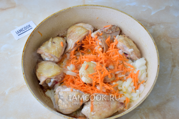 Каждое куриное бедро разрежьте на 2 части и обжарьте с двух сторон, чтобы мясо изменило цвет.