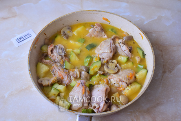 Кабачки и грибы немного уменьшились в размере. Если хотите, чтобы было больше подливы, то добавьте еще воды.