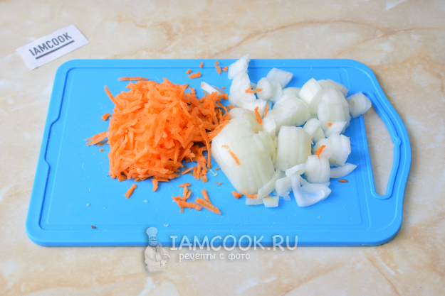 В это время очистите лук и морковь. Потрите морковь на терке, а лук нарежьте.