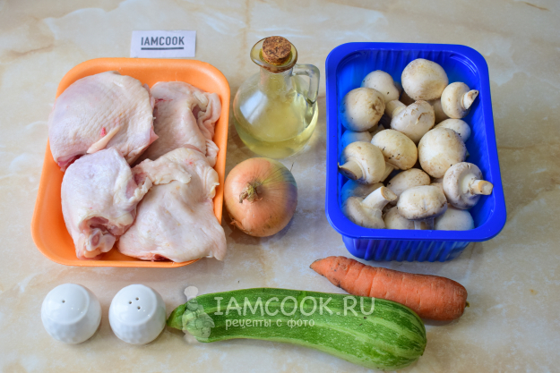 Перед началом приготовления курицы с кабачками и грибами соберите необходимые ингредиенты по списку. Можно взять любые части курицы. Я буду готовить бёдрышки. Кабачок берите молодой, небольшого размера, чтобы у него была тонкая шкурка.