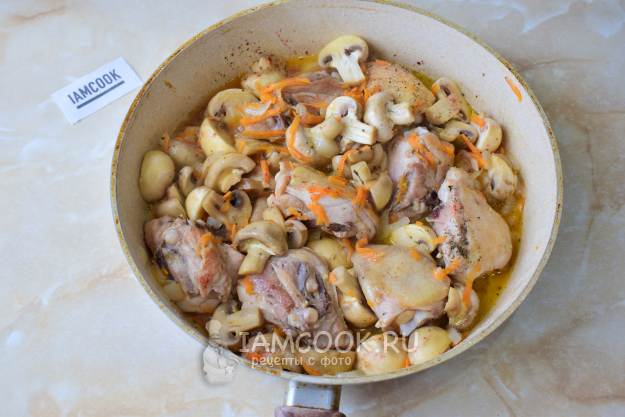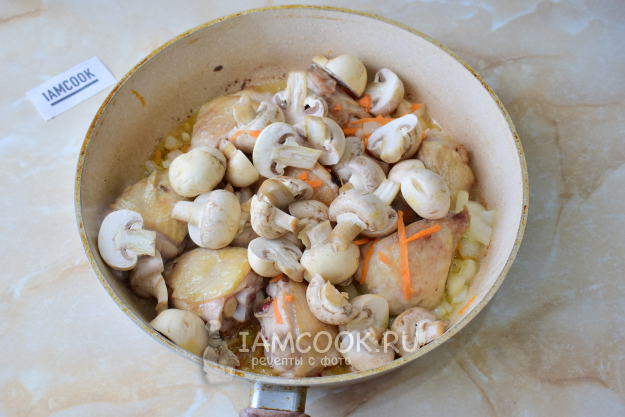 Затем добавьте шампиньоны. Крупные грибы можно разрезать на 4 части, средние достаточно пополам. Обжарьте еще пару минут.