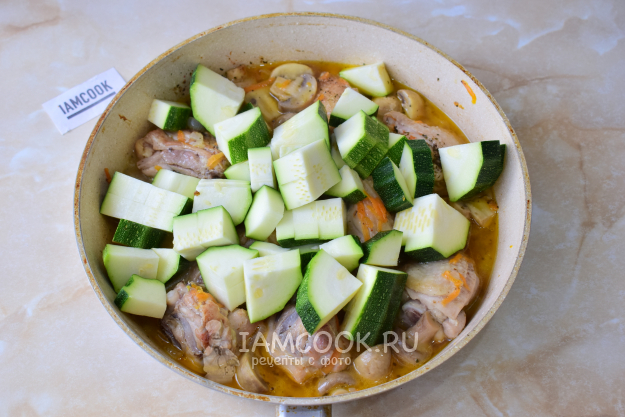Затем добавьте в сковороду нарезанные кабачки и тушите еще минут 15-20.