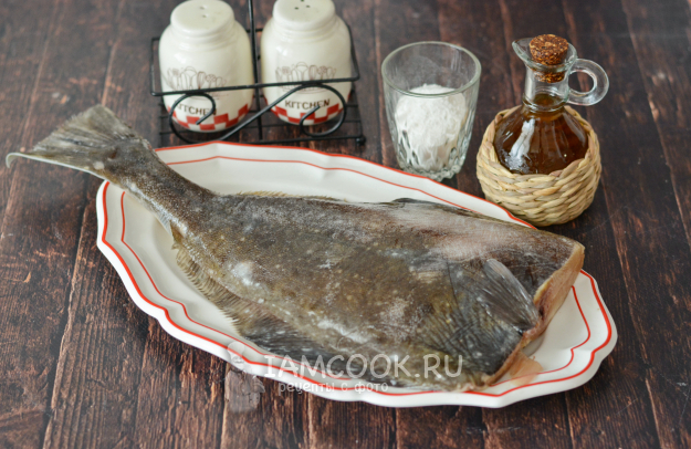 Соберите все продукты для приготовления жареного палтуса на сковороде.