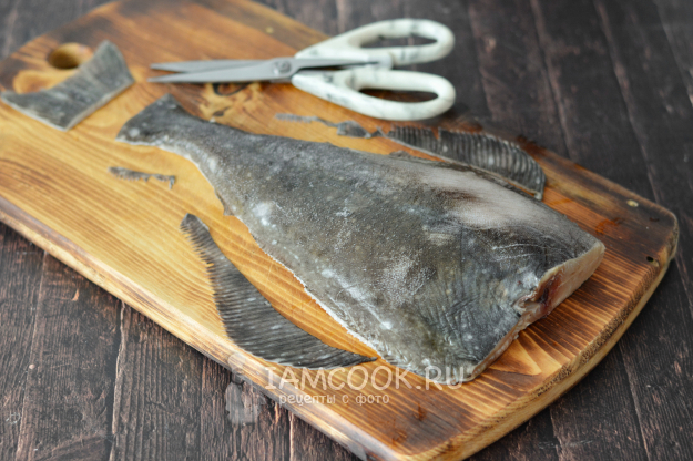 Кухонными ножницами срежьте боковые плавники и хвост. Затем промойте тушку палтуса снаружи и внутри под проточной холодной водой и обсушите салфетками внутри и снаружи.