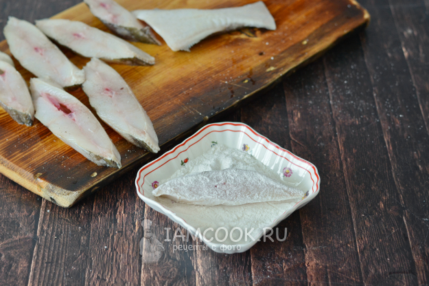 Посолите и поперчите куски палтуса по вкусу с двух сторон. Затем каждый кусочек обваляйте плотно со всех сторон в муке.