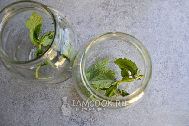Банки промойте горячей водой с содой. Простерилизуйте удобным для вас способом: в духовке, над паром или в микроволновке. Крышки прокипятите 5 минут. Веточки мелиссы промойте и отряхните от воды. Положите в каждую банку по одной небольшой веточке.